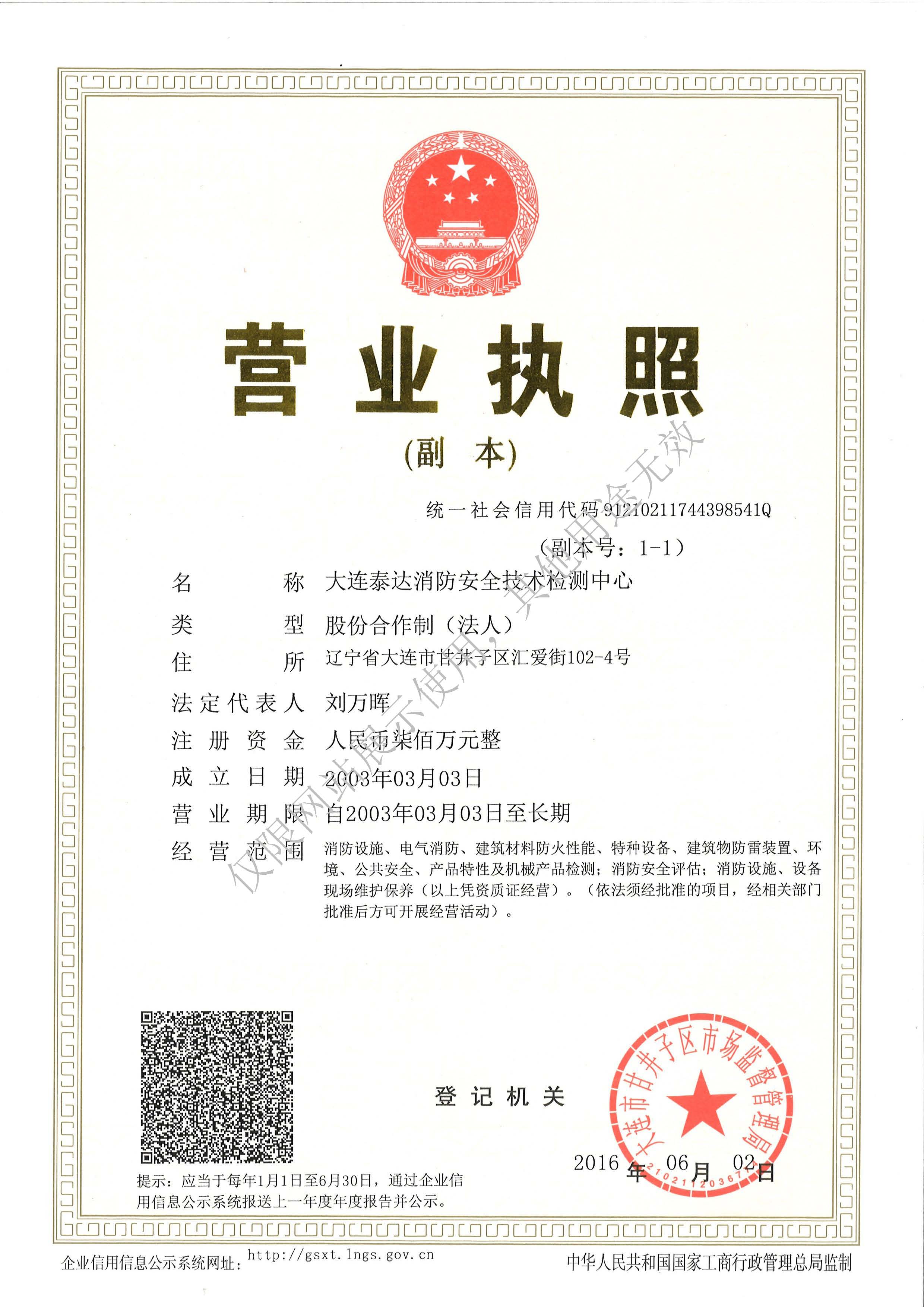 · 是經(jīng)“社會消防技術(shù)服務(wù)信息系統(tǒng)”備案并公示的消防技術(shù)服務(wù)機構(gòu),已取得中國氣象局頒發(fā)的雷電防護裝置檢測資質(zhì)證書、遼寧省質(zhì)量技術(shù)監(jiān)督局審核批準(zhǔn)的檢驗檢測機構(gòu)資質(zhì)認定證書(CMA)及包括消防檢測、電氣檢測、雷電防護裝置檢測、防火涂層厚度檢測等在內(nèi)的200余項檢驗檢測能力,取得大連市應(yīng)急管理局頒發(fā)的安全生產(chǎn)標(biāo)準(zhǔn)化證書,獲得質(zhì)量管理體系、環(huán)境管理體系、職業(yè)健康安全管理體系認證證書,是經(jīng)備案的高新技術(shù)企業(yè),可獨立出具具有證明作用的檢測報告。